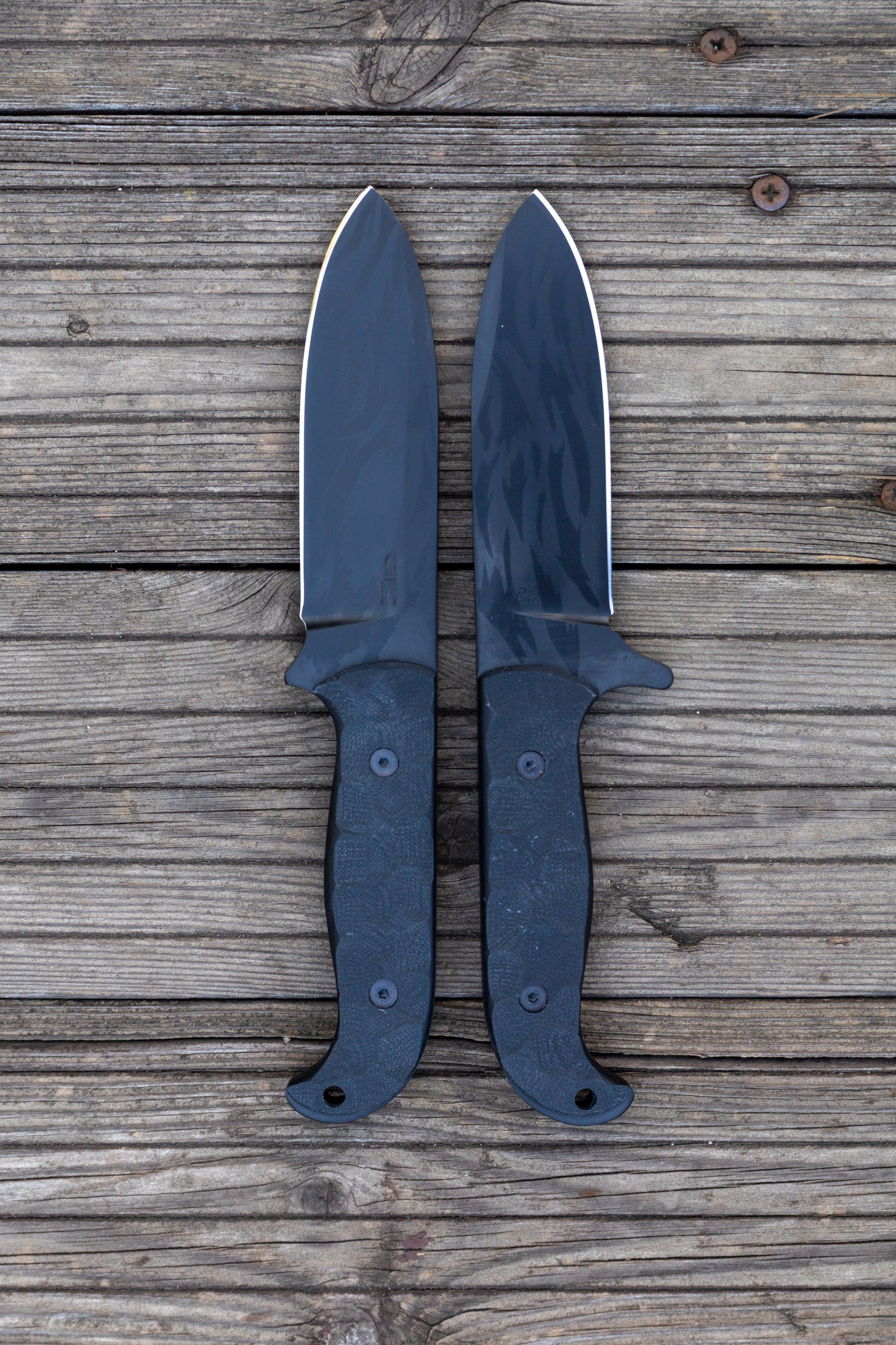 The spear point blade has a false swedge for better penetration, but it will maintain tip strength. The knife has a symmetric high saber grind this makes it strong but maintains a good geometry. In the Initial batch the blades are made from differentially tempered Apex Ultra Steel at 62-63 HRC on the edge and with a significantly softer tang to maintain strength.